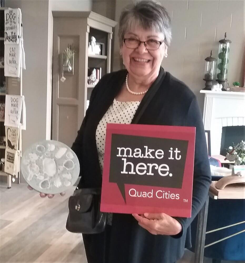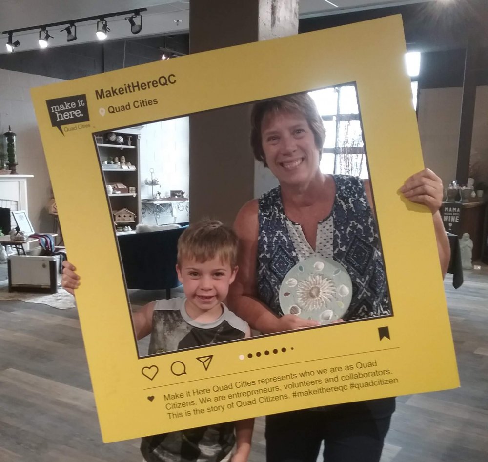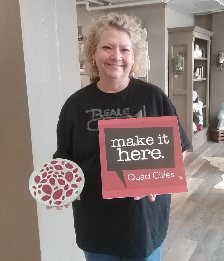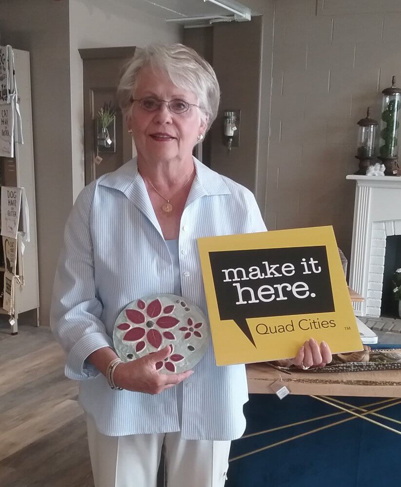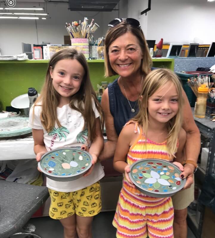 On a special Saturday in July, three groups of roughly 30 people each, mostly women, along with their moms, daughters, grandchildren, and friends sat around tables in Isabel Bloom’s large finishing room, chatting with each other while arranging their collected treasures spread before them. They came together at the Isabel Bloom tour center for a special craft class to create a one-of-a-kind stepping stone for their garden or home. Most brought with them a bag of treasures; seashells personally collected from a trip to the beach, stones from a vacation getaway, or other meaningful keepsakes. Colorful tiles and river rock were also on hand for those that just wanted to make a pretty stone or needed to fill the spaces between their cherished mementos.