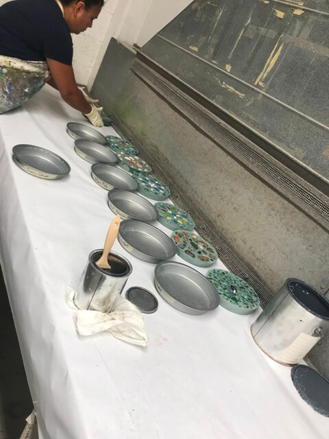 Next door in the mixing room, Bloom caster Dave was busy mixing a barrel of green tinted cement which would be poured into the 30 cake pans that had been prepped with a release agent. The cake pans were distributed, with the help of Bloom artisans and a few of their children (who love helping at these events). Next the stones, shells, tiles and other items would carefully be arranged on top of the wet cement, then gently pushed down into the wet mixture to help secure them in place.