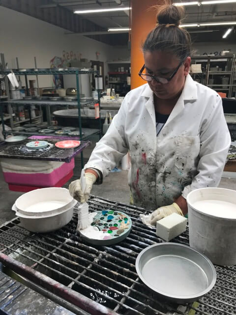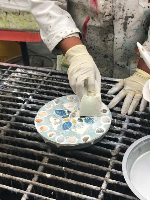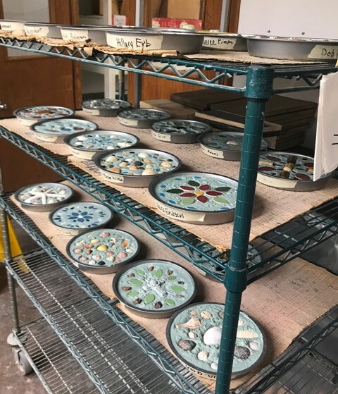By the end of the day, there were nearly 100 of these special “memory stones” sitting on shelves to cure overnight. In the days to come our artisans will carefully pop them out of the pans and apply our traditional white finish to each stone, being careful to wipe clean the treasures that were set in place.