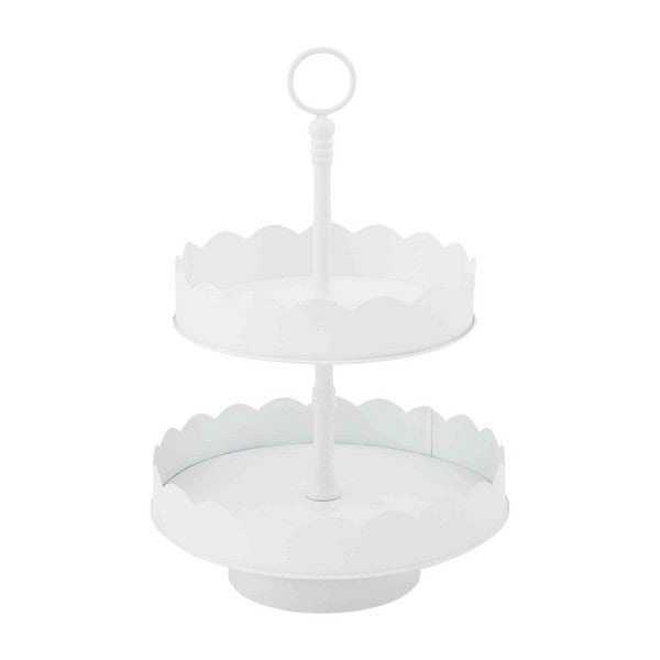 A metal two-tier server featuring a beautiful white coloring and scalloped edges. We love using this server as a decorative piece – add your favorite seasonal decor to each layer.