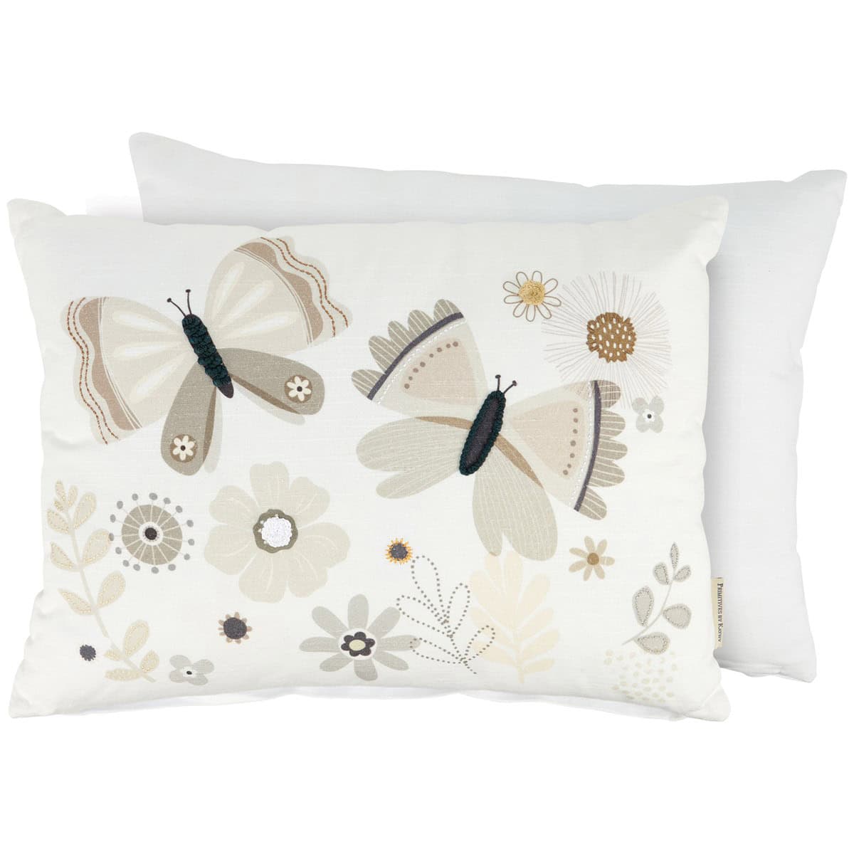 A beige cotton pillow displaying butterflies and florals on the front with embroidered and raised cotton accents for added texture. Floral pillow features a zipper to easily remove and clean machine-washable pillow cover. A stylish floral-themed home accent perfect for any room.