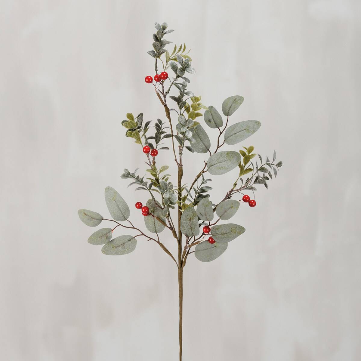 A plastic and wire eucalyptus and berries pick. This accessory is part of our IB Home Accents line and was carefully selected to complement our unique sculptures.