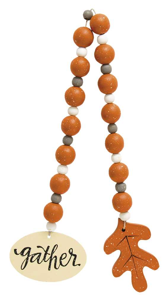 Gather Beaded Ornament is a string of orange, white and gray wooden beads with a wood medallion at one end that says “Gather,” and an orange wooden leaf at the other end. This accessory is part of our IB Home Accents line and was carefully selected to complement our unique sculptures.