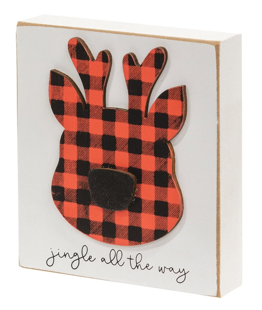 Jingle All the Way Plaid Reindeer Block features a raised, wooden reindeer icon covered in a red buffalo check pattern and reads, “jingle all the way.” There is a smooth white surface, distressed edges, and a keyhole on the back for optional hanging display. This wooden block measures 4″ tall by 3.5″ across and 0.75″ thick. This accessory is part of our IB Home Accents line and was carefully selected to complement our unique sculptures.