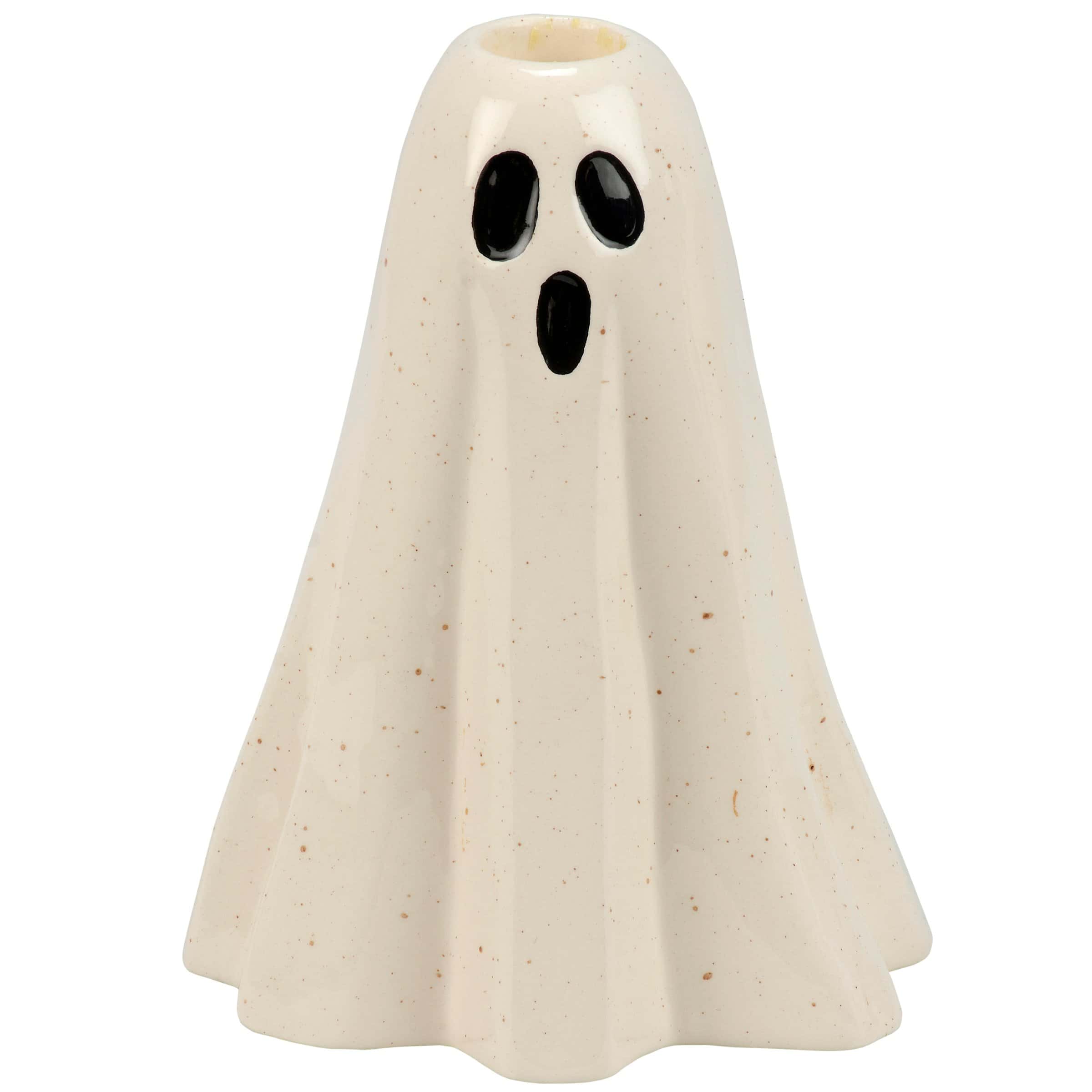 A ceramic candle holder that coordinates well with décor. Seasonal candle holder features a fun sculpted sheet ghost design with a painted boo face and a slot on top to place a single candle. Our Scary Ghost candle holder fits standard taper candles and can free-stand on flat surface for display. Candle pictured not included. A fun Halloween home accent perfect for adding natural lighting to any space.