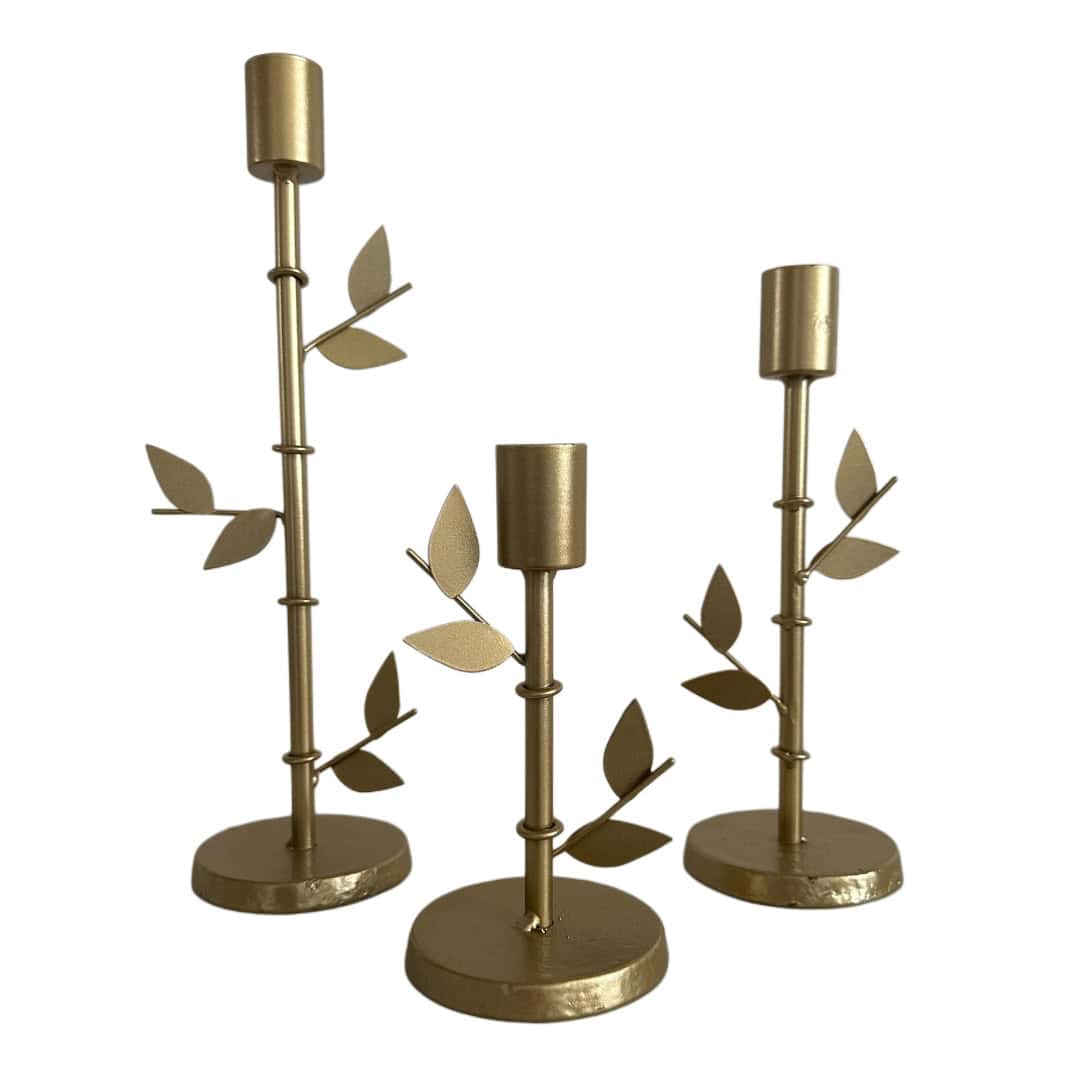 Metal candle holders painted gold designed to look like branches with leaves. Comes as a set of 3.