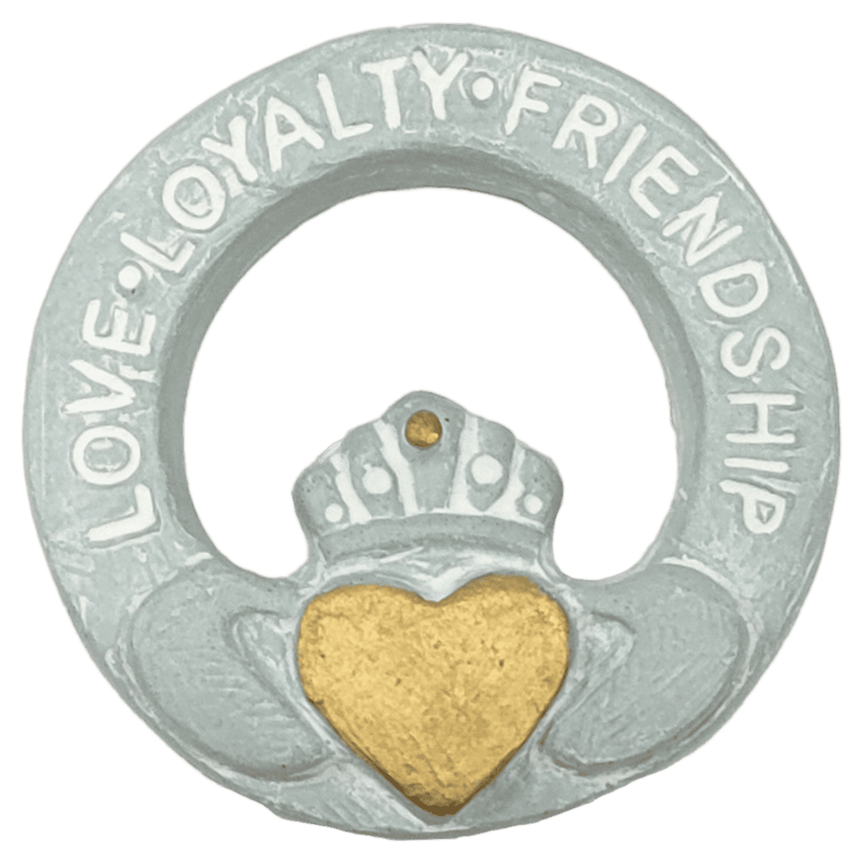 Our Claddagh sculpture is a heartfelt interpretation of the traditional Irish symbol of love, loyalty, and friendship. Featuring a heart for love, a crown for loyalty, and two hands for friendship, this design is cast in classic green concrete with a hand-painted gold heart topped by a crown. A meaningful gift for an Irish friend, a loyal companion, or anyone you hold close to your heart.