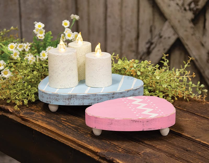 Add height and interest to your spring displays with our festive wooden Easter egg risers. These can be used to elevate a featured product or create depth within a tabletop arrangement. The edges and sides have a nicely weathered look for rustic, vintage appeal. Each sold separately. Candles in photo not included.