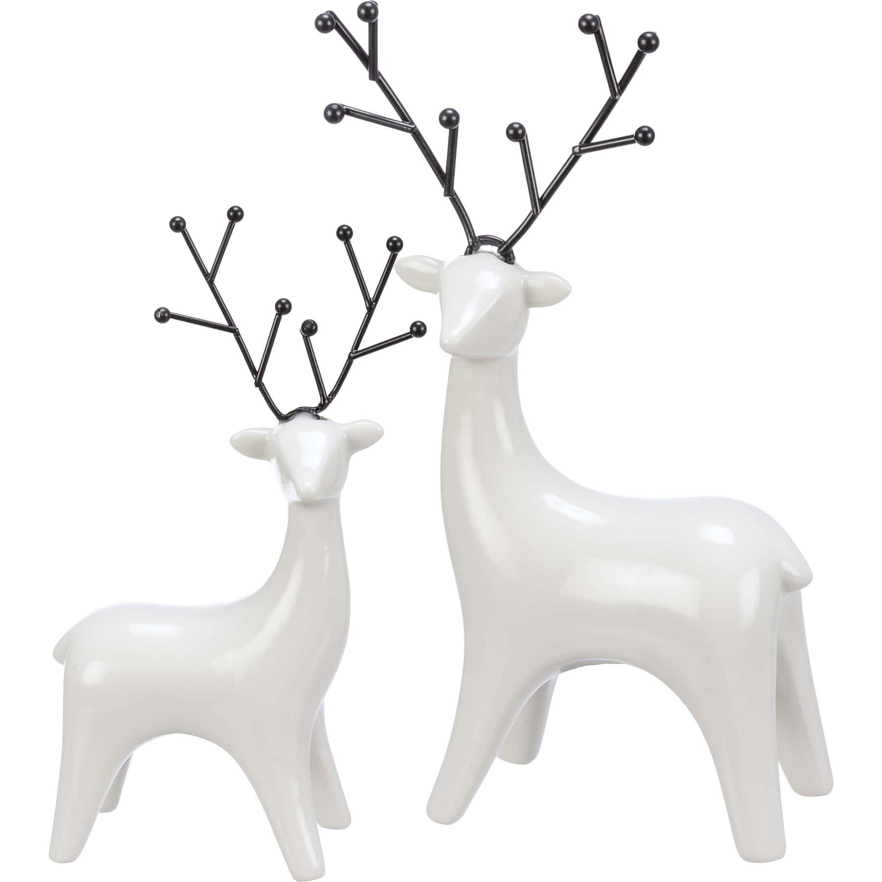 A set of two ceramic deer figurines featuring a glossy white glaze with black metal antler details.