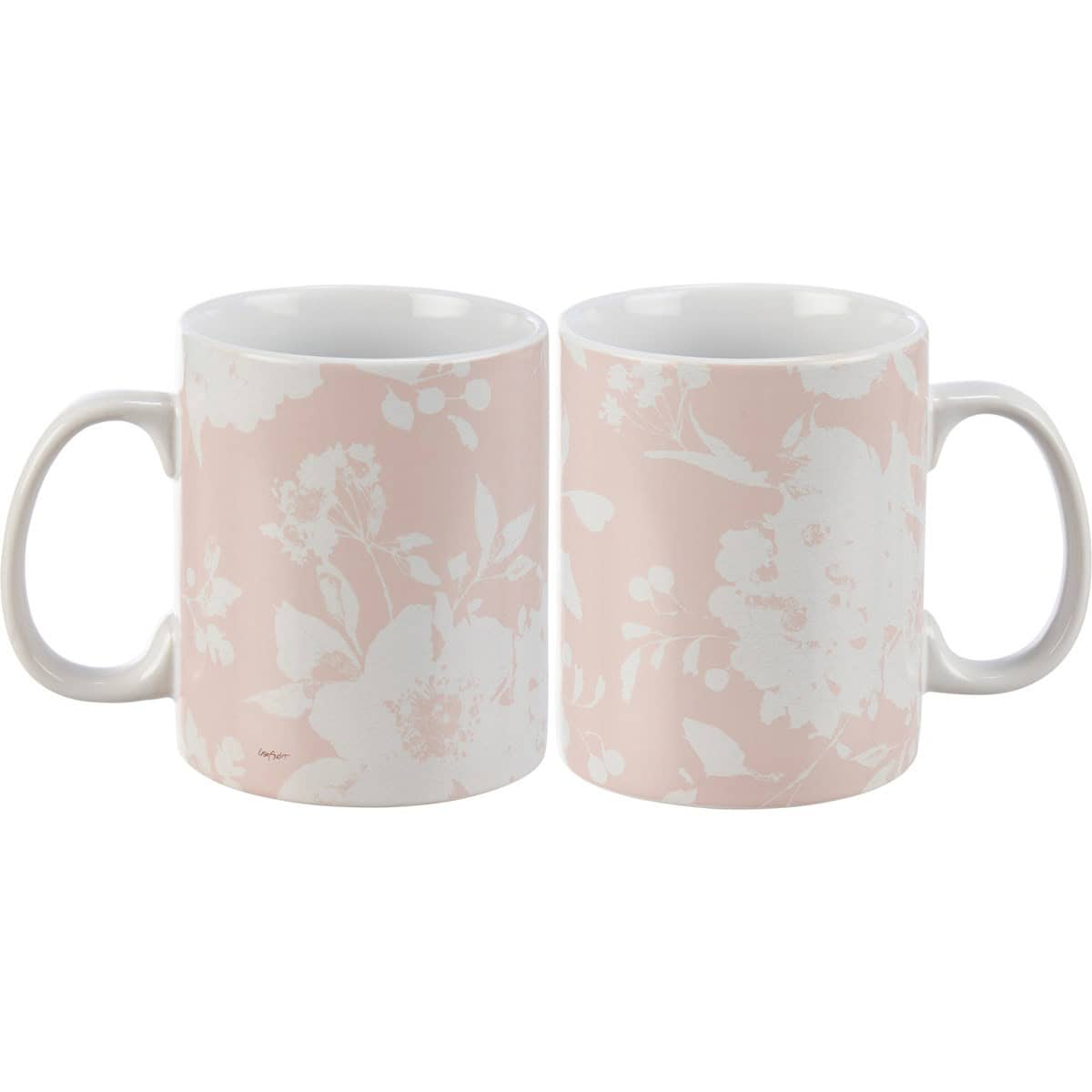 A stoneware 20 oz mug displaying a full wrap-around design of pastel pink with elegant florals. The blush Floral mug is microwave, oven, dishwasher, and food safe.