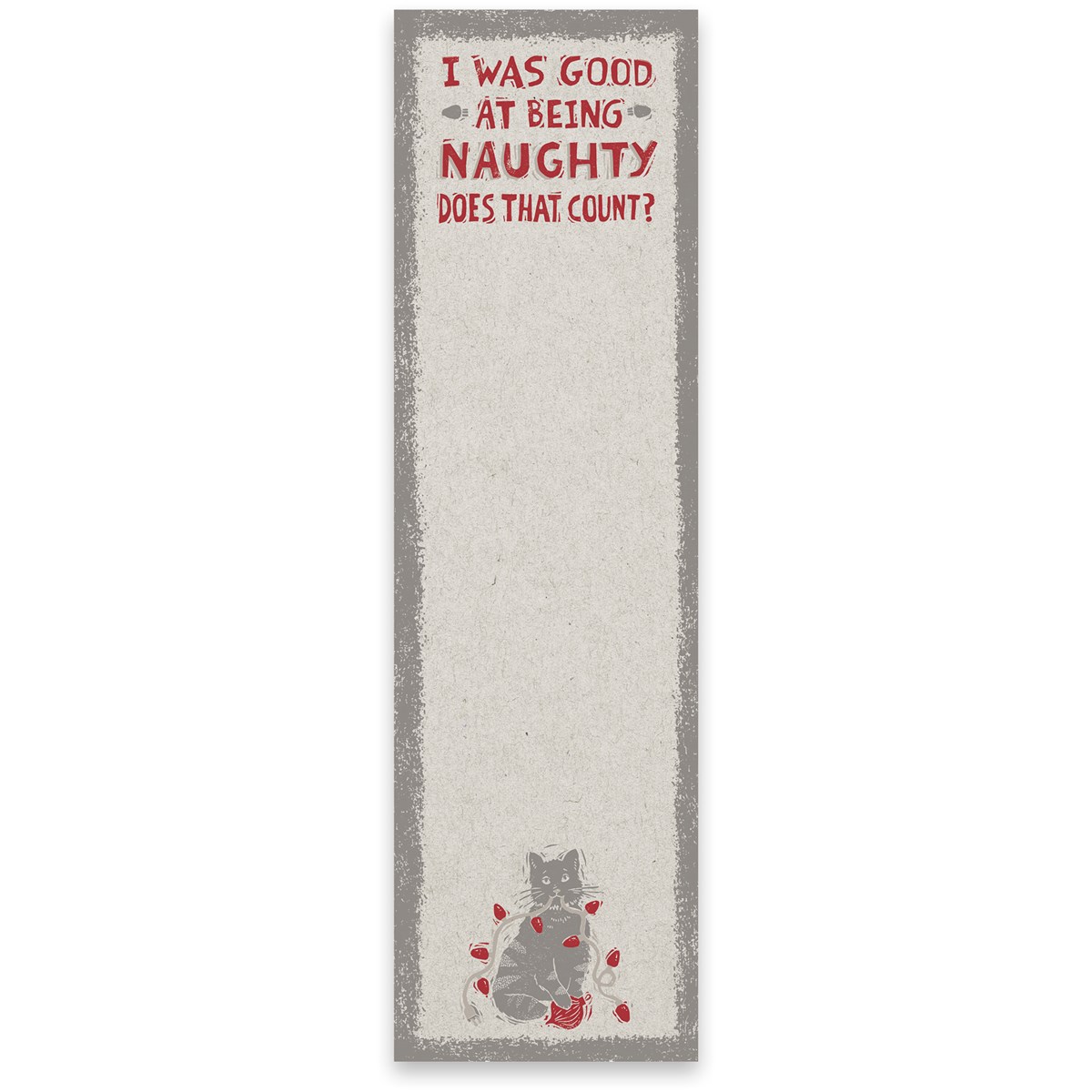 Christmas-themed magnetic paper list notepad featuring intricate, age-old block carving and printmaking techniques. Lends “I Was Good At Being Naughty – Does That Count?” block print sentiment with cat tangled in lights design. Complements well with coordinating block print pieces for a festive holiday collection. Includes 60 pages. Made in USA.