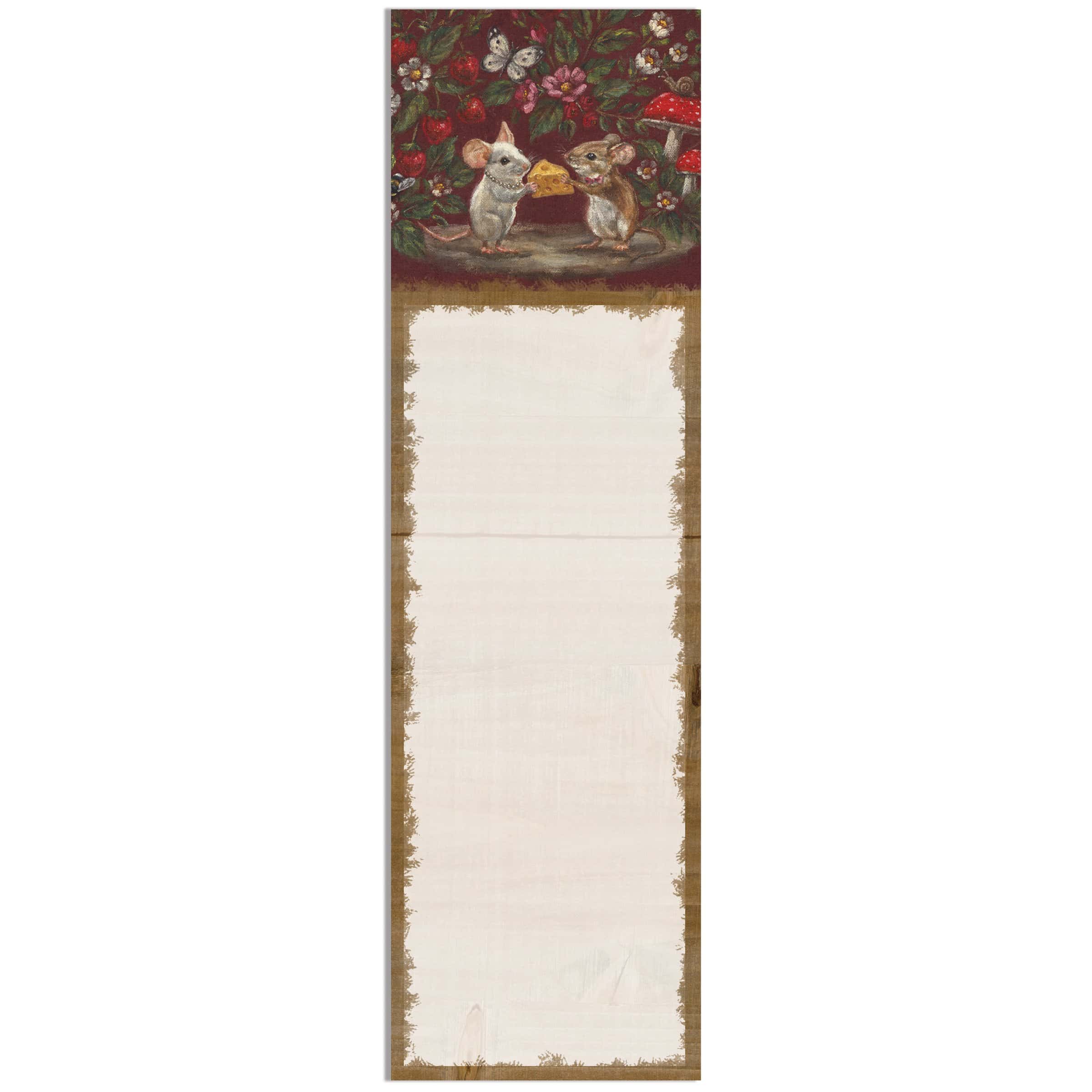 A list notepad displaying a heartwarming scene of moody florals surrounding a cute mouse couple gifting a piece of cheese with a decorative space underneath for writing. Valentine mice design is replicated from original artwork painted onto burlap canvas, giving the art a unique depth and texture. This Mouse Love list pad includes 60 pages and a strong magnet to easily hang on magnetic surface for display. Proudly made in the USA. An animal-themed Valentine’s Day gift perfect for adding functional style to any space.