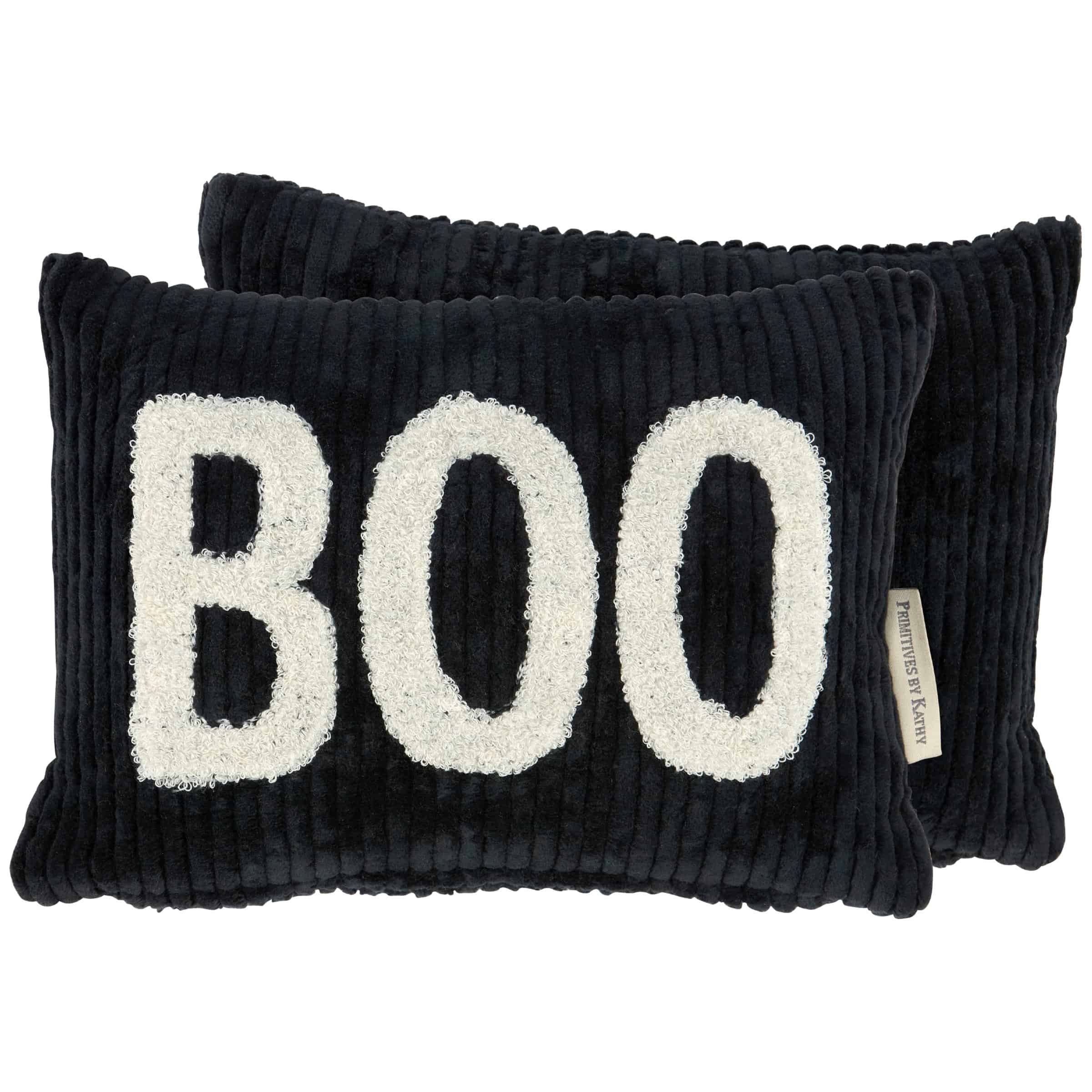 A black corduroy pillow displaying a fun seasonal sentiment that reads “BOO” featuring a raised cream cotton texture. Our Boo pillow features a zipper to easily remove and clean machine-washable pillow cover. Seasonal pillow contains polyester filling and is shipped vacuum-sealed for protection and storage. A Halloween home accent perfect for adding seasonal style to any room.