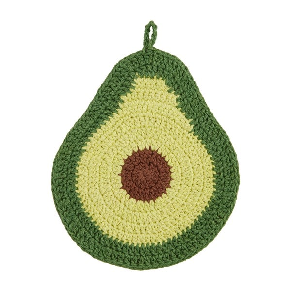 Add a touch of fun and style to your kitchen with the Avocado Fiesta Pot Holder. This crochet knit pot holder features a vibrant avocado design on the front, made from a blend of 84% cotton, 9% rayon, and 7% polyester. The back is crafted from 100% cotton for added durability. Easy to clean with just a spot cleaning, this pot holder is the perfect accessory for any avocado lover or anyone looking to add a pop of color to their kitchen decor.