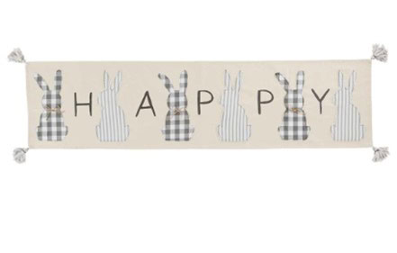 Canvas table runner features bunny applique and corner cotton tassels. This accessory is part of our IB Home Accents line and was carefully selected to complement our unique sculptures.