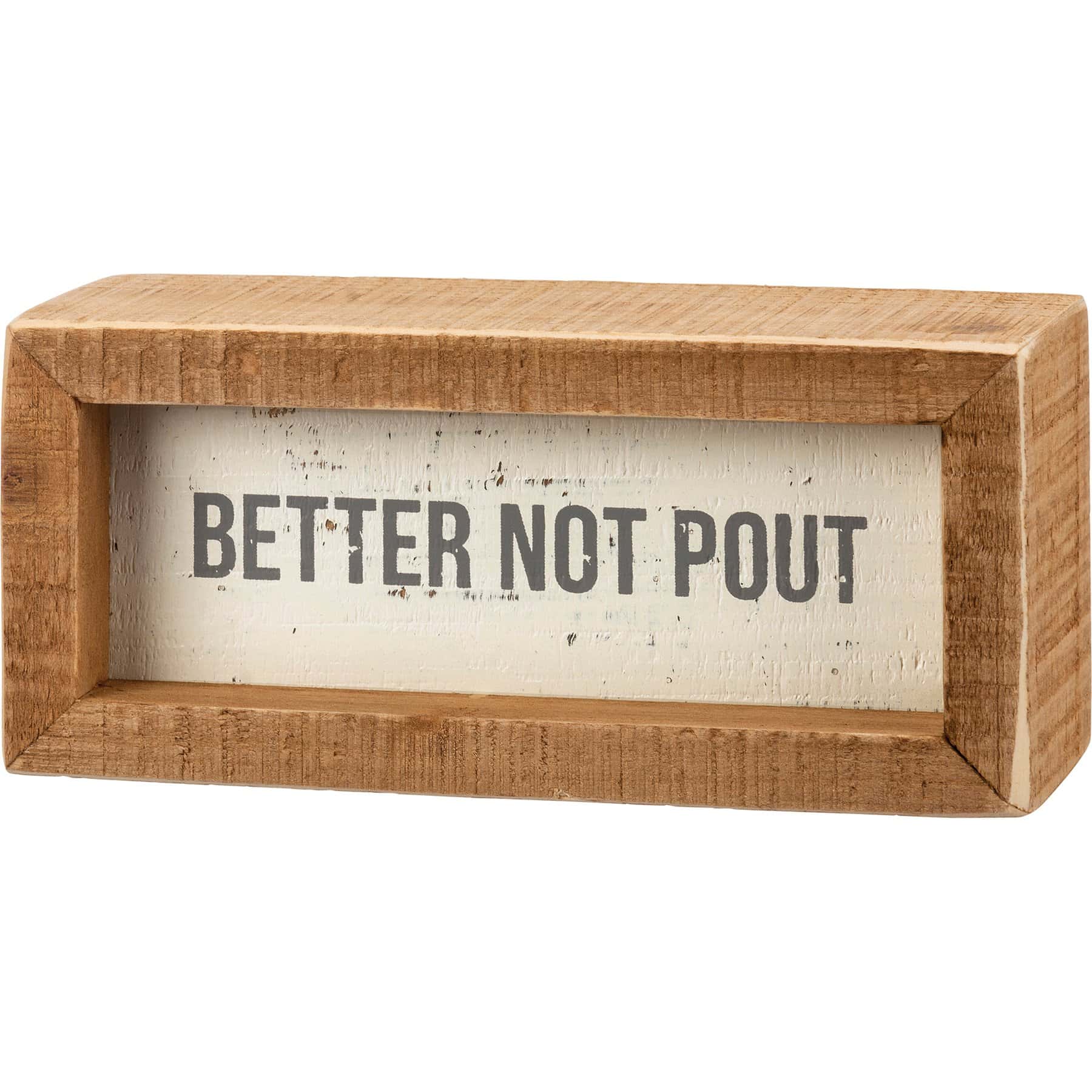 An inset wooden box sign featuring “Better Not Pout” sentiment. Easy to hang or can free-stand alone.