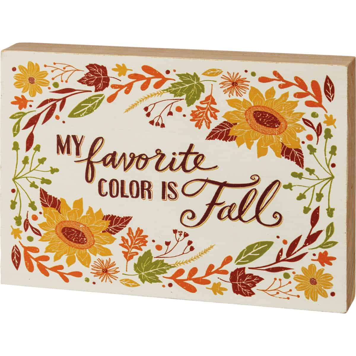 A wooden block sign featuring vibrant fall florals and “My Favorite Color Is Fall” sentiment. Easy to hang via predrilled keyhole slot or can free-stand alone.