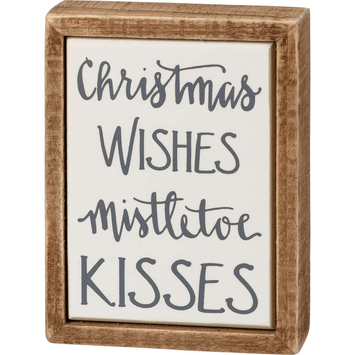 A wooden box sign mini featuring a seasonal “Christmas Wishes Mistletoe Kisses” sentiment in a unique hand illustrated style. Box sign features a natural wood frame and faux enamel finish behind design for a tile-like appearance. This accessory is part of our IB Home Accents line and was carefully selected to complement our unique sculptures.