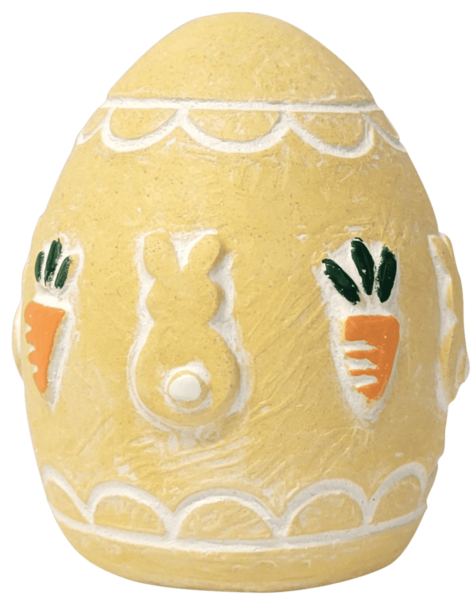 Standing 3¼ inches tall, this Spring Egg sculpture features a fresh new bunny and carrot motif and stands slightly taller than previous designs. Cast in a soft yellow concrete and finished with hand-painted details on the bunnies and carrots, it adds a cheerful pop of color to your spring décor. Perfect for Easter baskets, tabletop displays, or seasonal shelves.