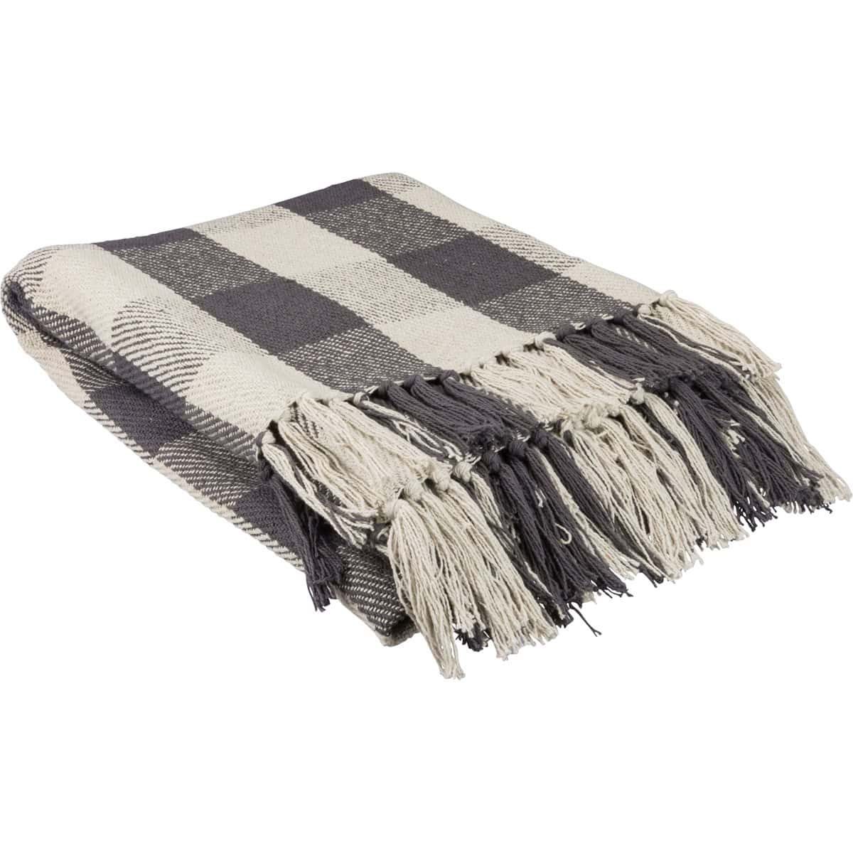 A farmhouse style cotton throw blanket featuring an all-over buffalo check pattern. Features decorative fringed accents. Machine-washable.