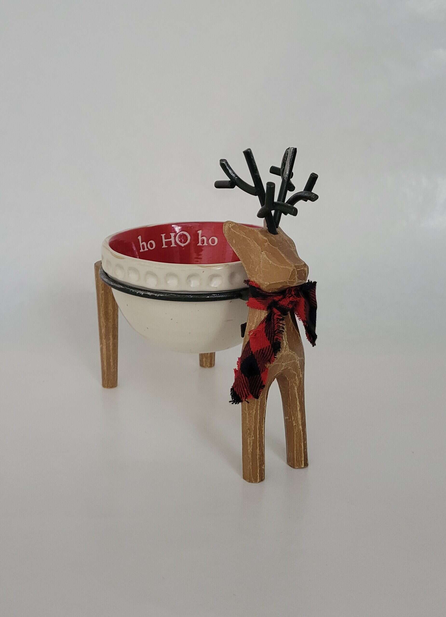 This adorable Tidbit Stand features a reindeer stand holding a white stoneware bowl with red insides reading “ho Ho ho”. This item is perfect for nuts, candies any small holiday treats. This reindeer stands 5.75″ tall with a 4″ metal ring to hold the stoneware bowl (3 7/8″ diameter x 2 1/4″ tall).