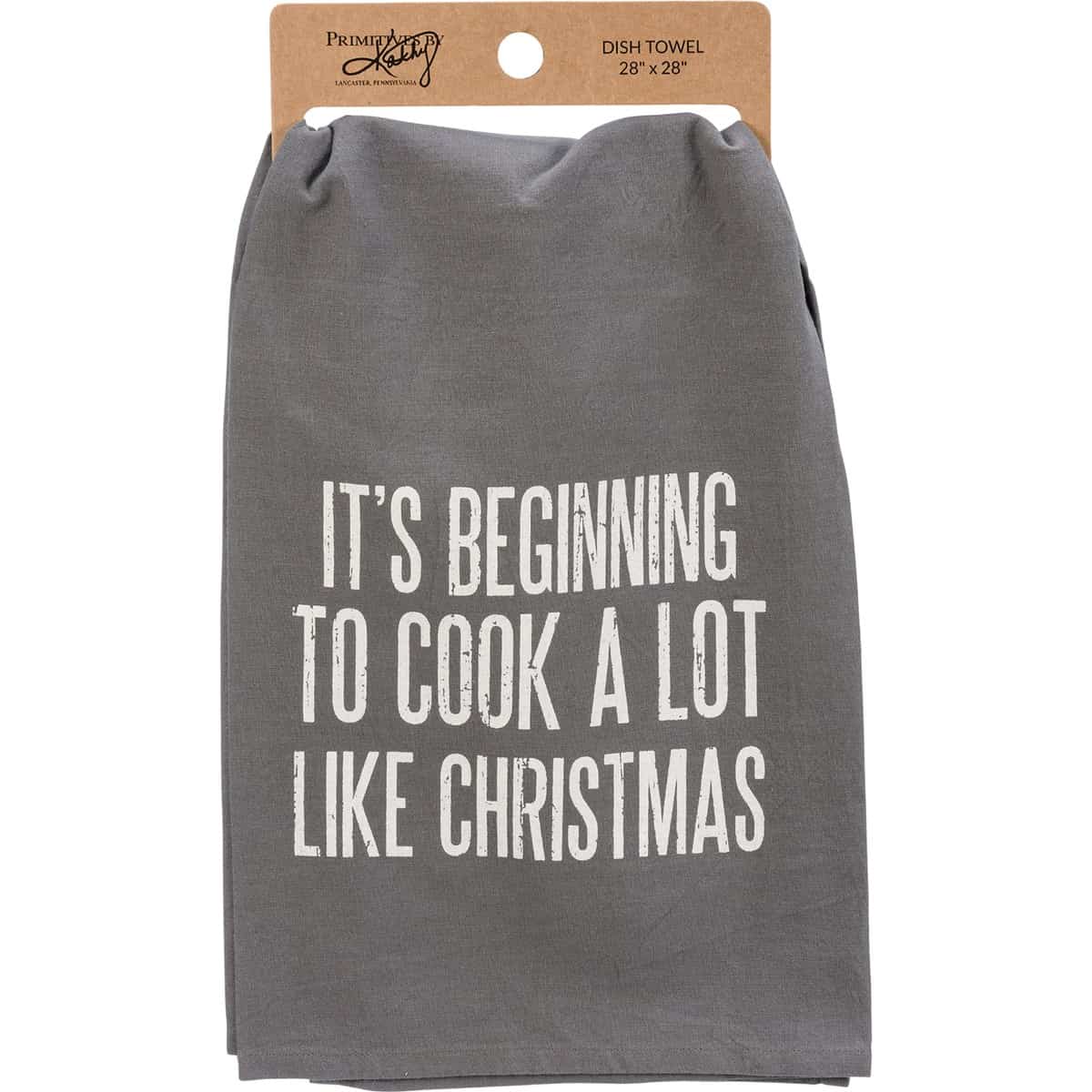 A Box Sign Style cotton kitchen towel featuring a distressed “It’s Beginning To Cook A Lot Like Christmas” sentiment in cream on a gray base. This accessory is part of our IB Home Accents line and was carefully selected to complement our unique sculptures.