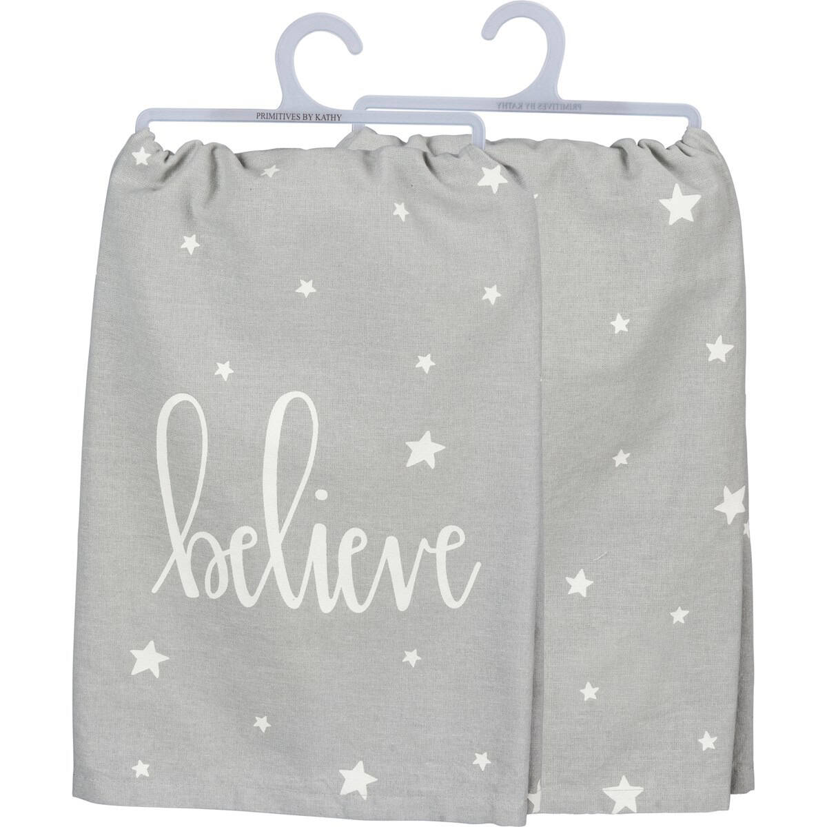 A gray and white cotton kitchen towel featuring a hand lettered “Believe” sentiment with star designs throughout.