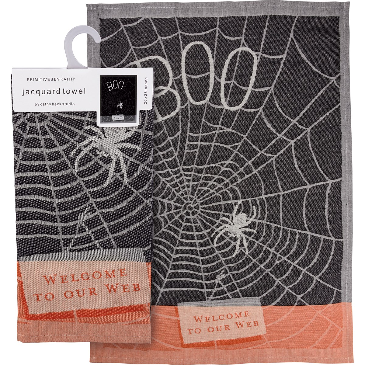 A jacquard woven kitchen towel featuring “Welcome To Our Web” and “BOO” sentiments and all-over spider web design. Machine-washable.