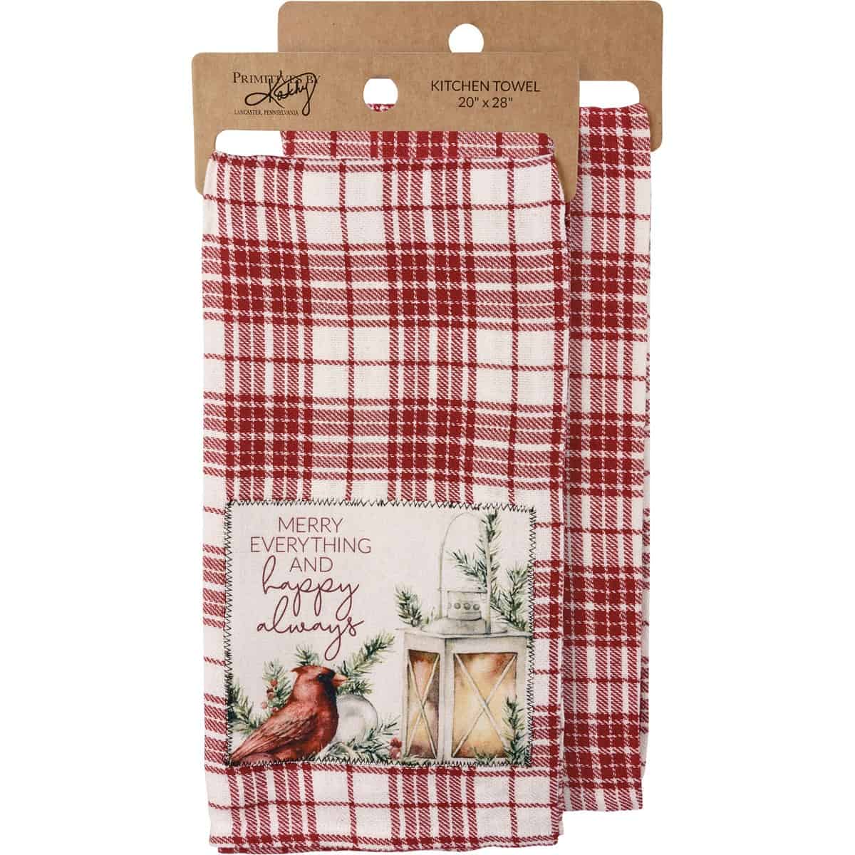 A woven cotton kitchen towel featuring a stitched art panel with “Merry Everything And Happy Always” sentiment and watercolor greenery, cardinal, and lantern designs. Features an all-over red plaid pattern. This accessory is part of our IB Home Accents line and was carefully selected to complement our unique sculptures.