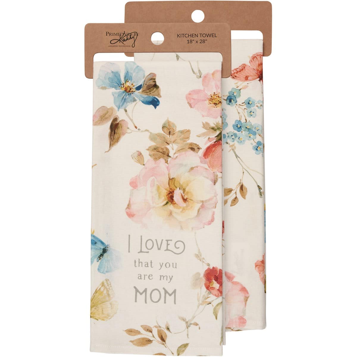 A cotton kitchen towel displaying delicate watercolor designs of a butterfly and colorful flowers all-over towel. Design also features heartwarming sentiment that reads “I Love That You Are My Mom.” This accessory is part of our IB Home Accents line and was carefully selected to complement our unique sculptures.