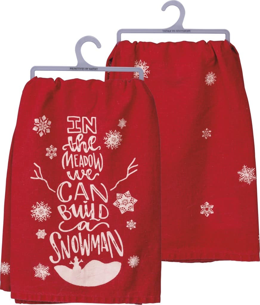 A red and white cotton dish towel featuring a “In The Meadow We Can Build A Snowman” sentiment with snowman and snowflake illustrations throughout. This accessory is part of our IB Home Accents line and was carefully selected to complement our unique sculptures.