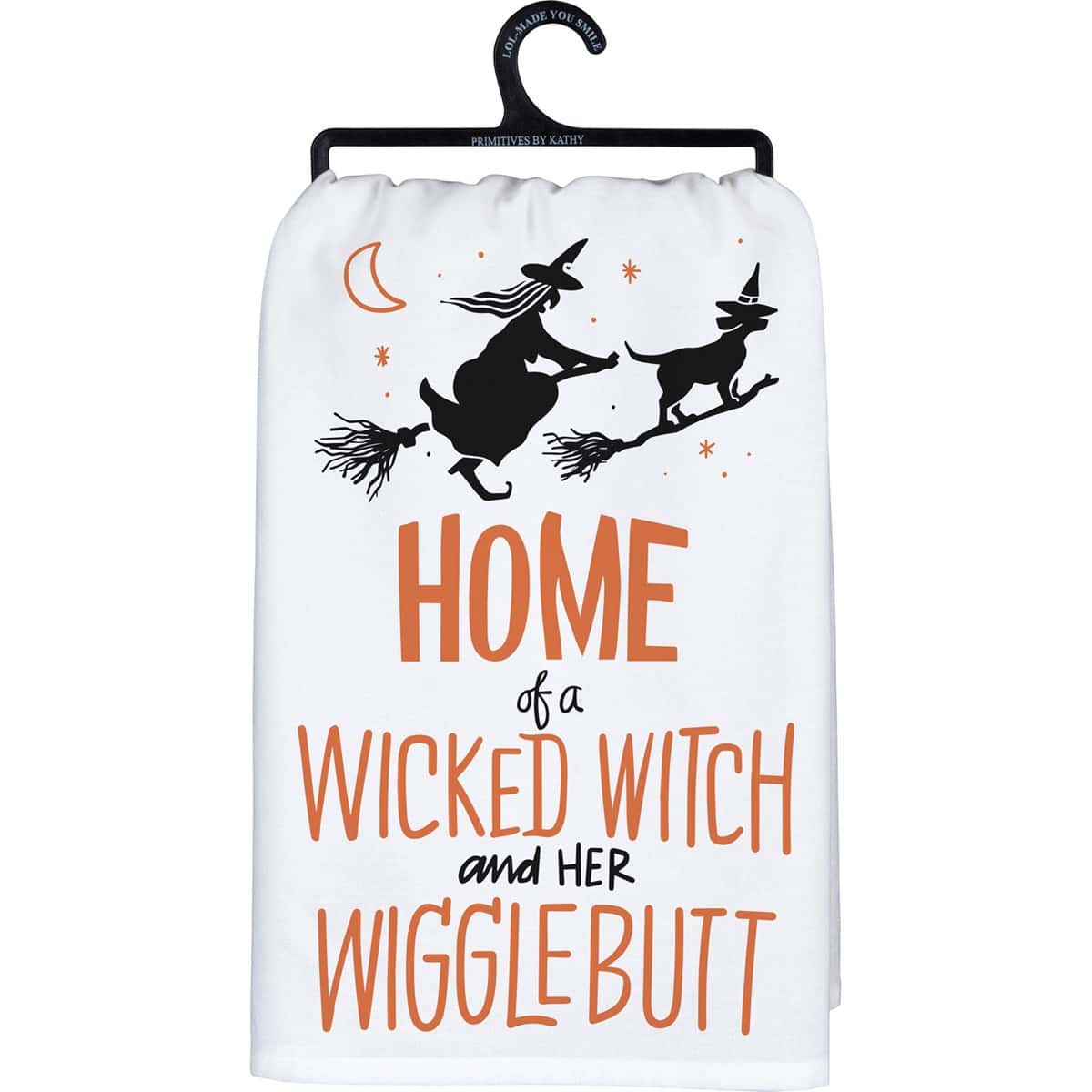 A black and white cotton kitchen towel displaying a unique hand illustrated design of a witch and a dog riding brooms in front a night sky. Design also includes orange accents and sentiment that reads “Home Of A Wicked Witch And Her Wigglebutt.” This accessory is part of our IB Home Accents line and was carefully selected to complement our unique sculptures.