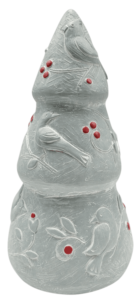 This 11″ handcrafted concrete pine tree features sculpted birds, vines, and red berries. A beautiful accent for Christmas or year-round display—indoors or out.
