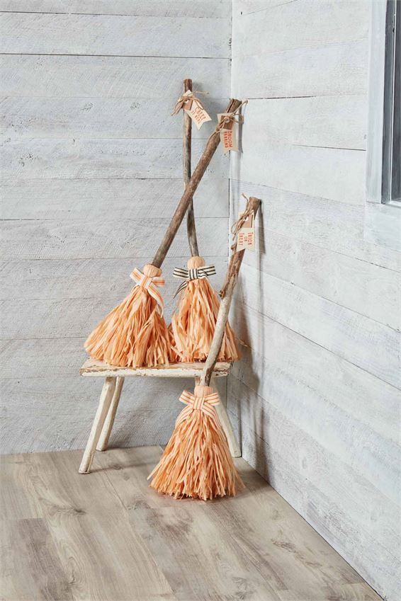 Life-size wood and raffia witch broom Halloween decor with printed canvas sentiment tag.