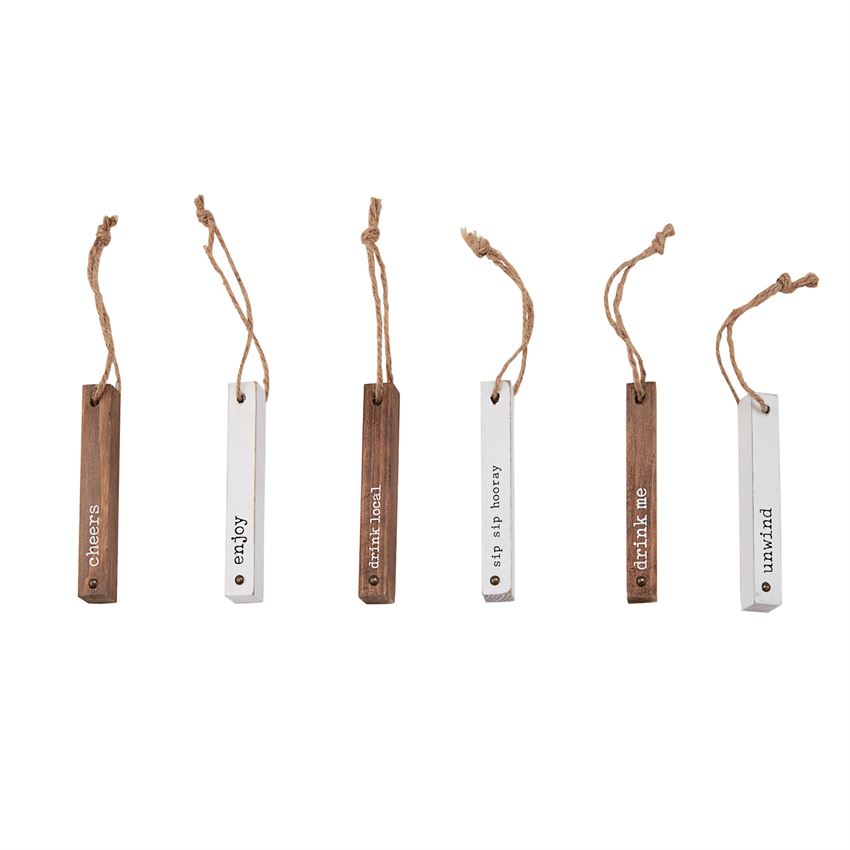 Printed sentiment wood wine bottle tag features brass rivet detail and twine loop hanger.