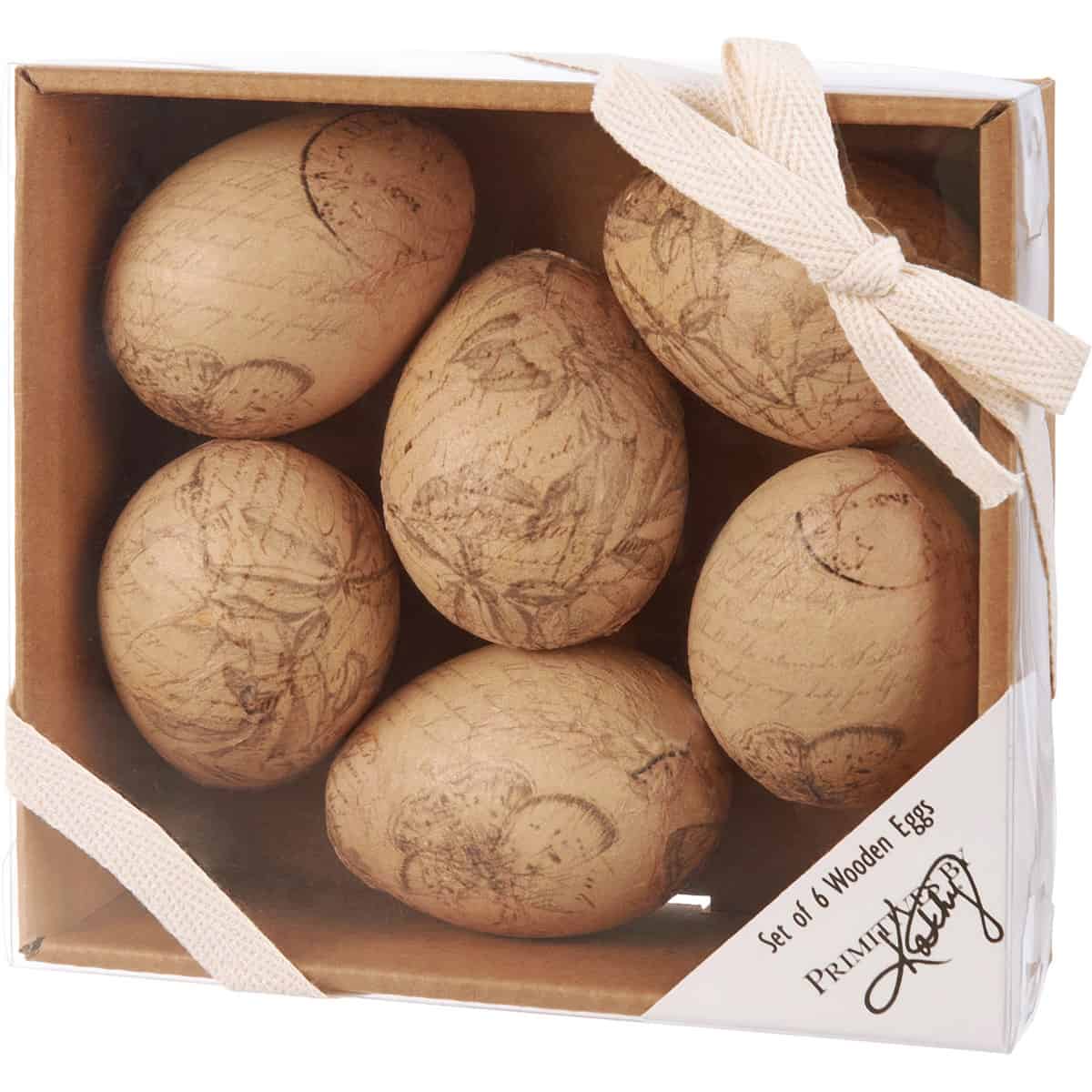 A set of 6 decorative wooden eggs displaying a vintage paper design wrapped around each egg for an antique aesthetic. Vintage paper features designs of butterflies, postal markings, and handwriting.